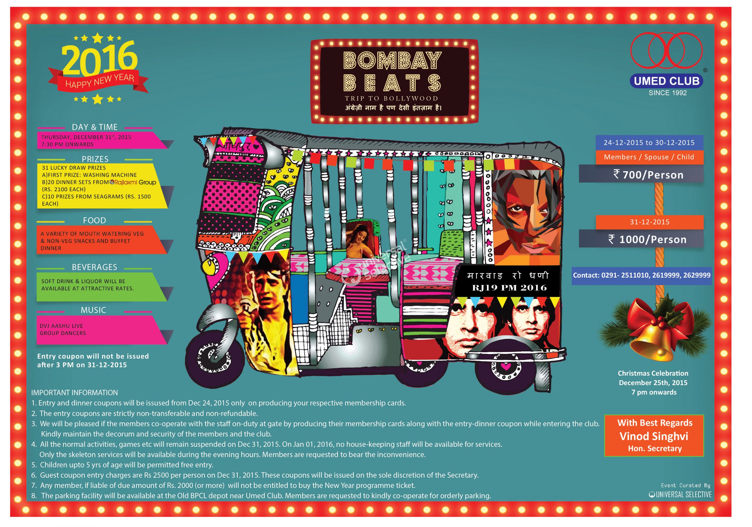 Universal Selective successfully carried out The New Year Bash 2016 at Umed Club which turned out to be a big hit amongst the club members. It was loved & adored by all and turned out to be one of the best New Year events so far. The success of the New Year event left the members with a happy memory of 2015.